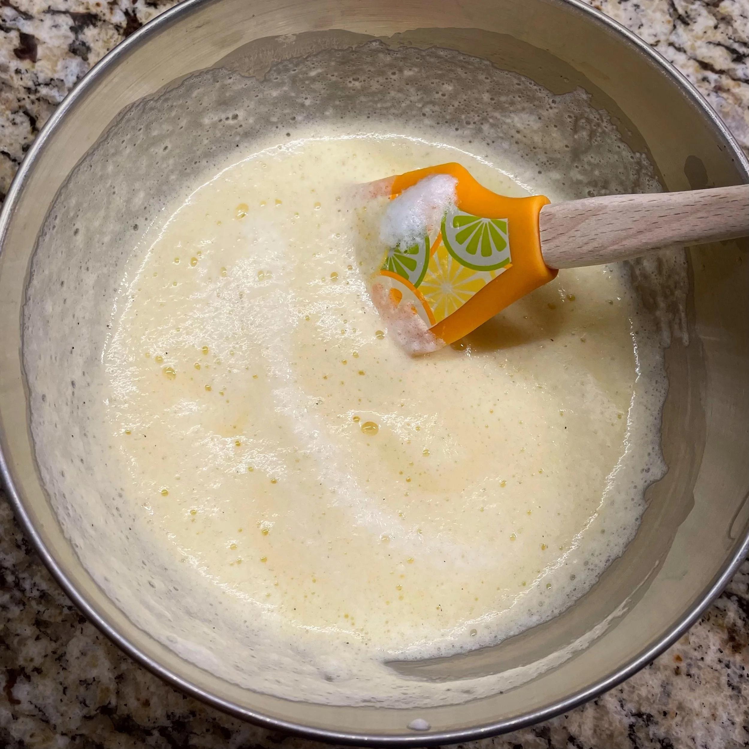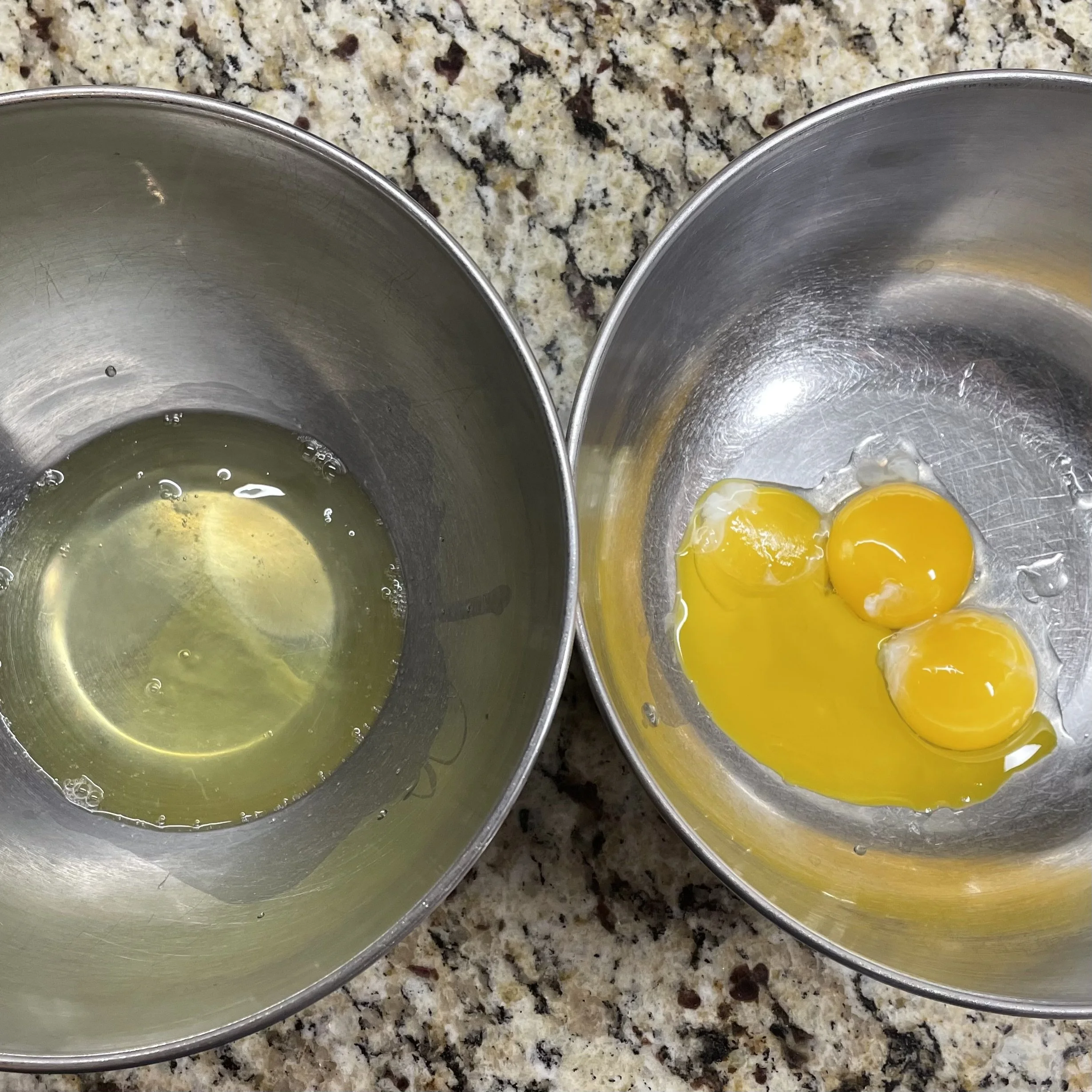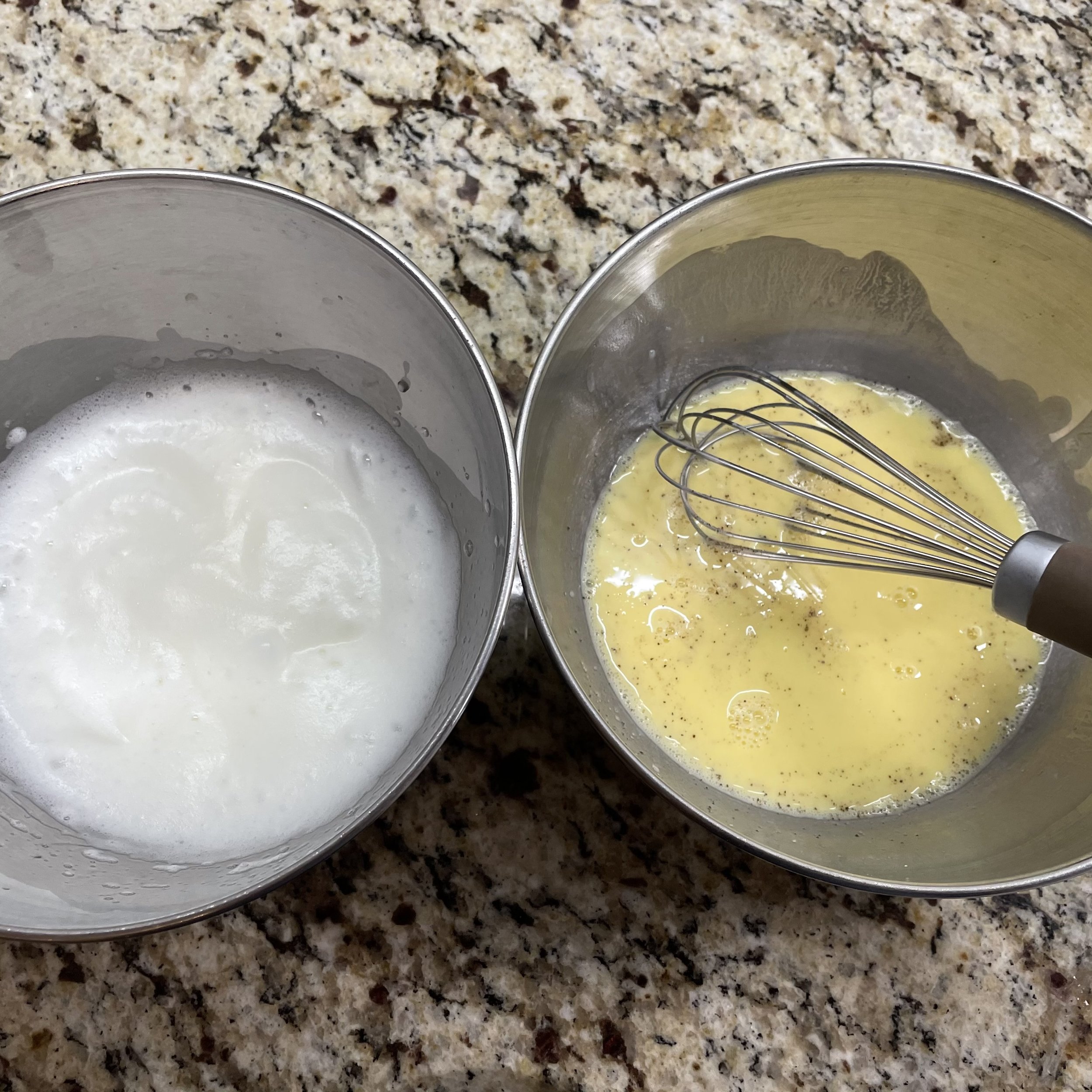 - Beat yolks of eggs with the milk, the beat egg whites and pour yolk mixture into them.