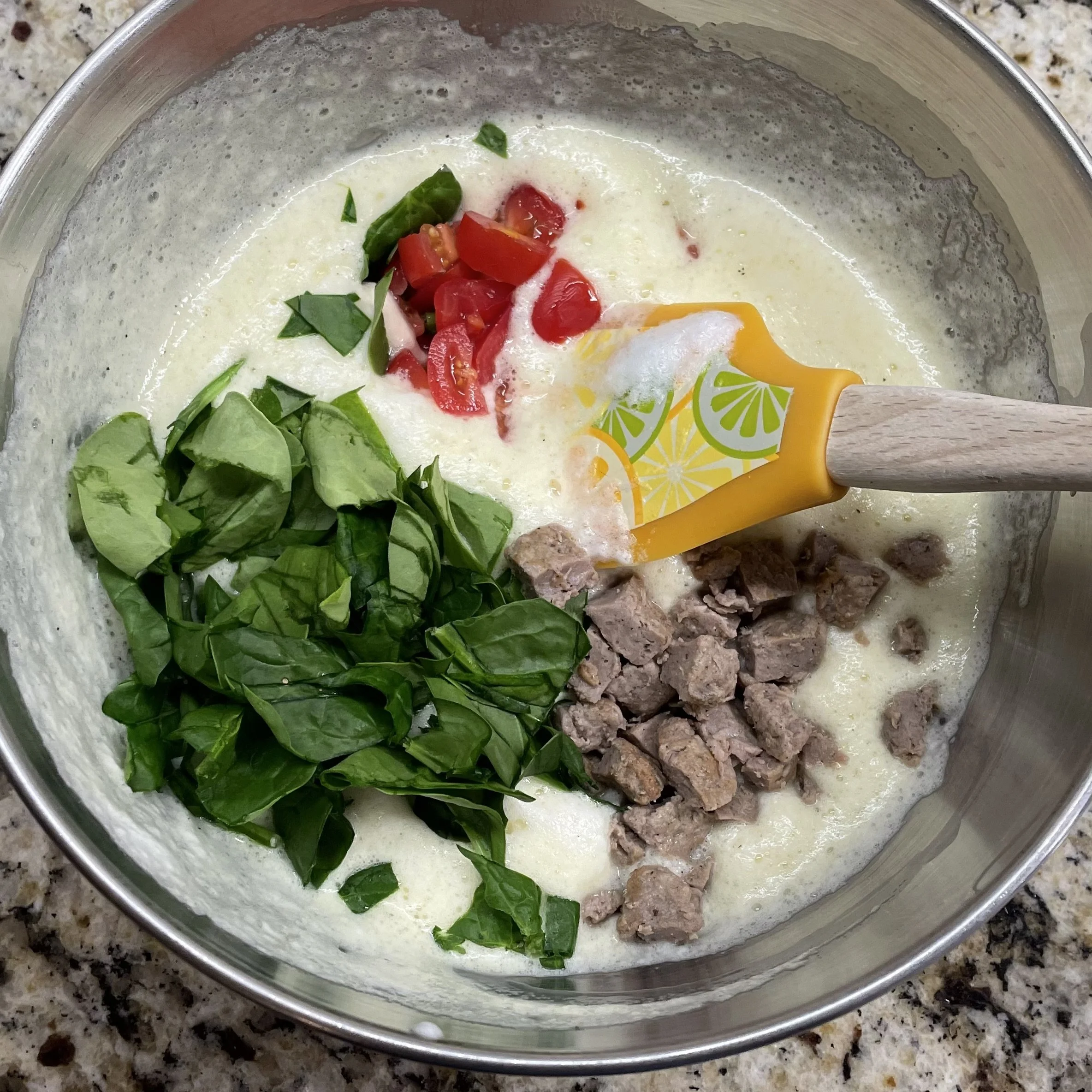 I chose to add a few flavorful add-ins like turkey sausage, spinach and tomatoes. You can do the same with your favorites, cheese would be another delicious addition.