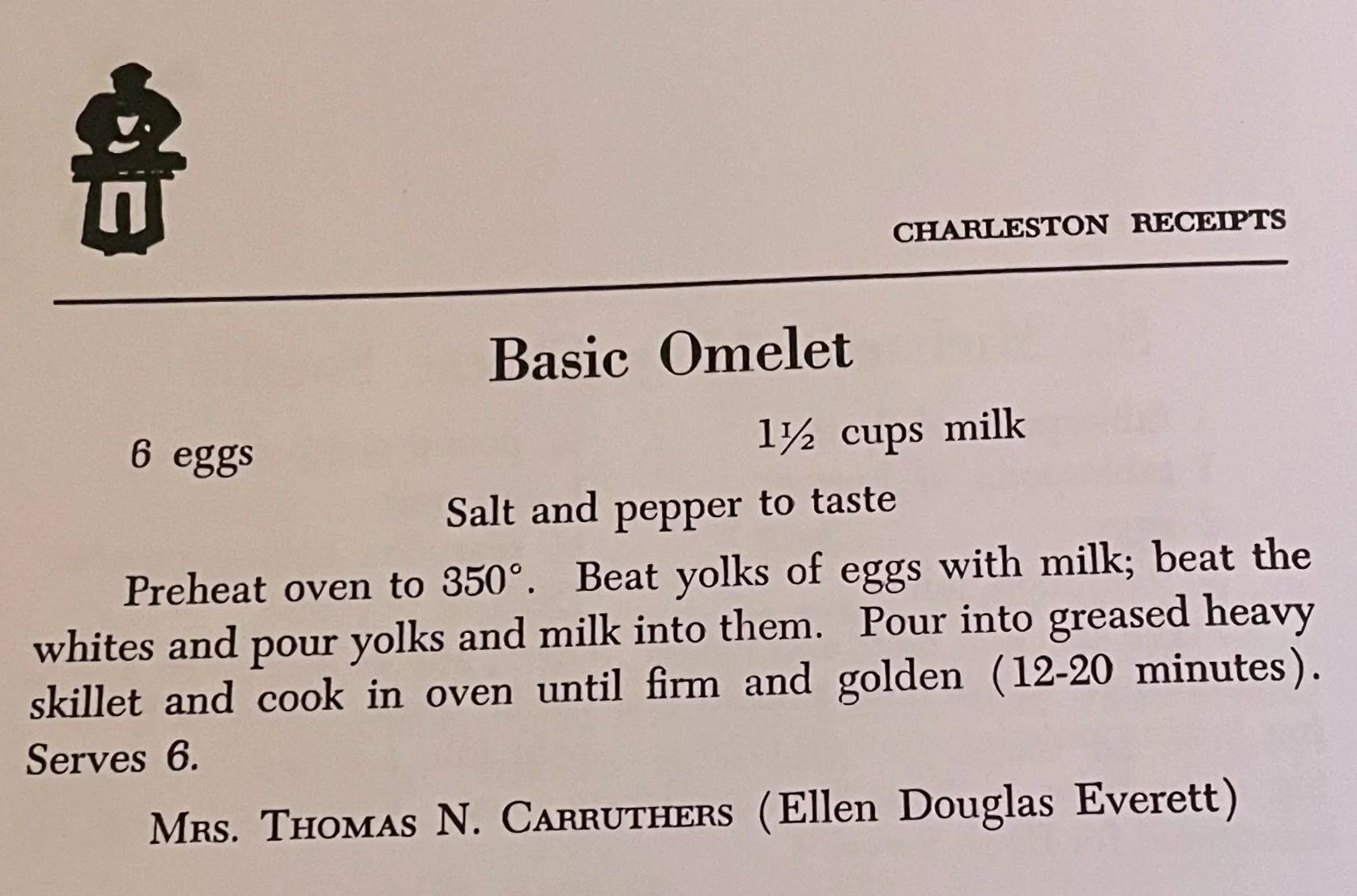 This Vintage Basic Omelet recipe came from a recipe book I bought on a trip to Charleston, SC last year. The book is shown in the photo above and you might be asking why it’s called Charleston “Receipts”? Once upon a time, recipes used to be called “receipts” in fact, it wasn’t too long ago. The recipe scrap book I was handed down from my grandmother has a few handwritten recipes with “receipt” written at the top. Anyhow, my love for vintage recipes (and eggs) inspired me to try this one that was original written by Mrs. Thomas N. Carruthers (Ellen Douglas Everett) Below is a photo of how it reads exactly, but I’ve created step-by-step photo instructions and added a few optional ingredients to my liking, as you can do the same. It serves 2-4 people.