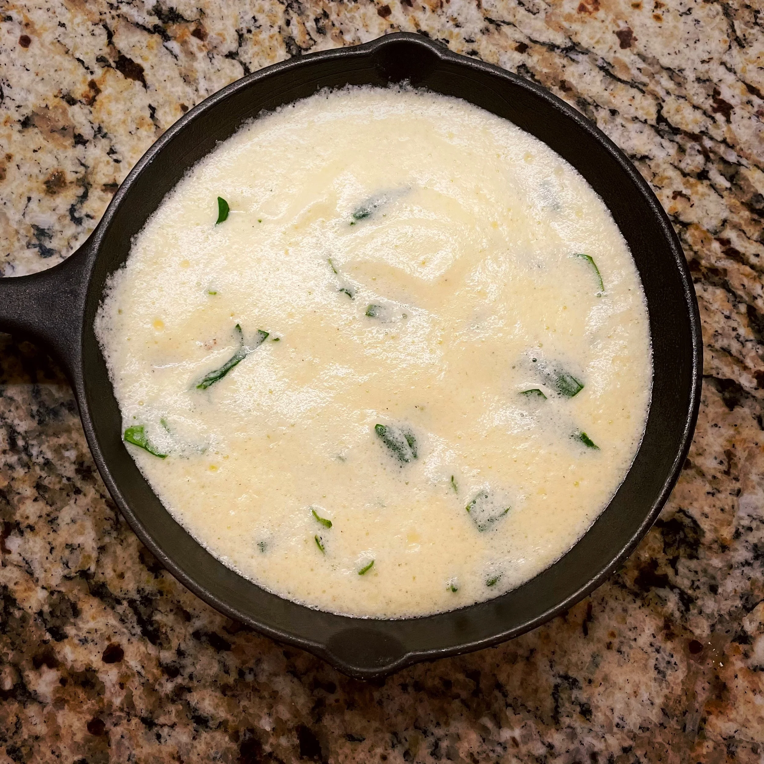 - Carefully pour mixture into a greased cast iron skillet. (You can also use an oven-safe pan.)